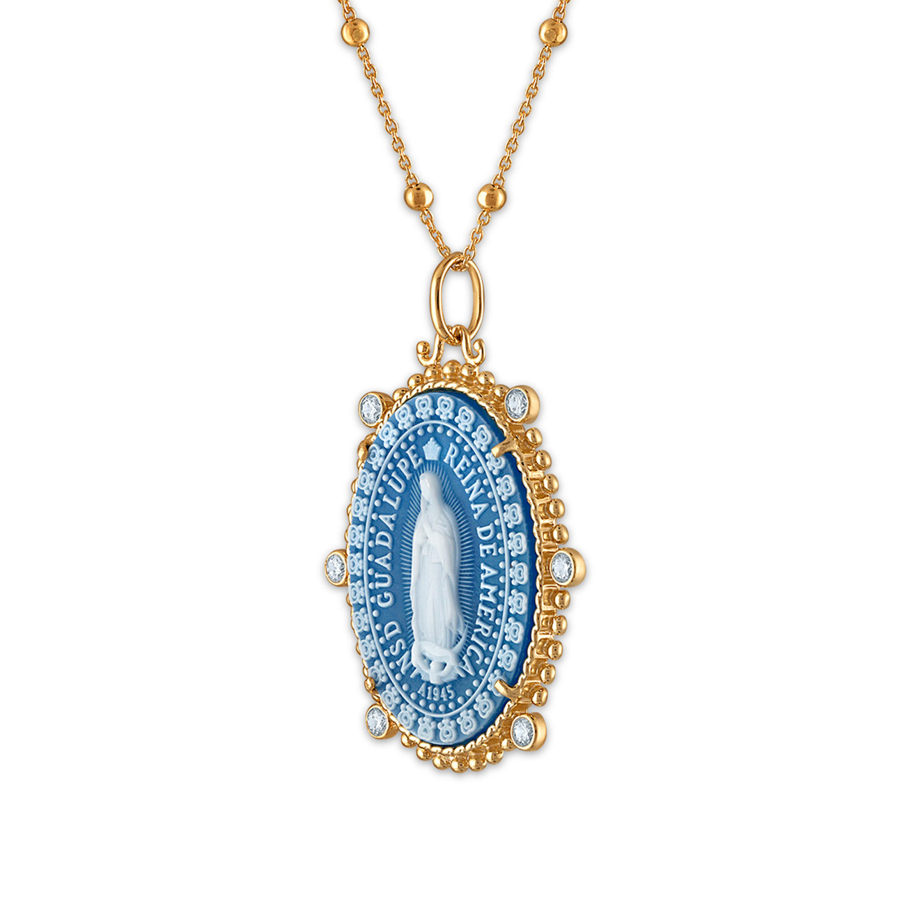 Con muchísima dedicación, el joyero Frank Ronay ha diseñado un camafeo hecho de ágata natural, reproduciendo la imagen de la Virgen de Guadalupe rodeada de un halo de flores.