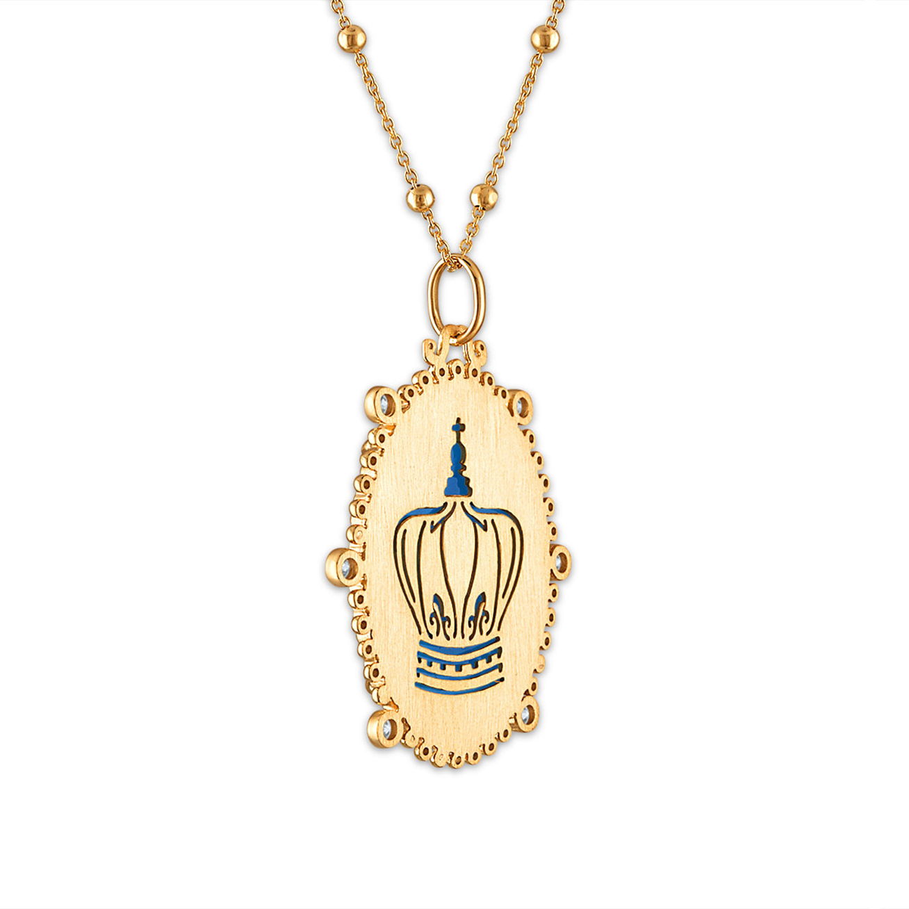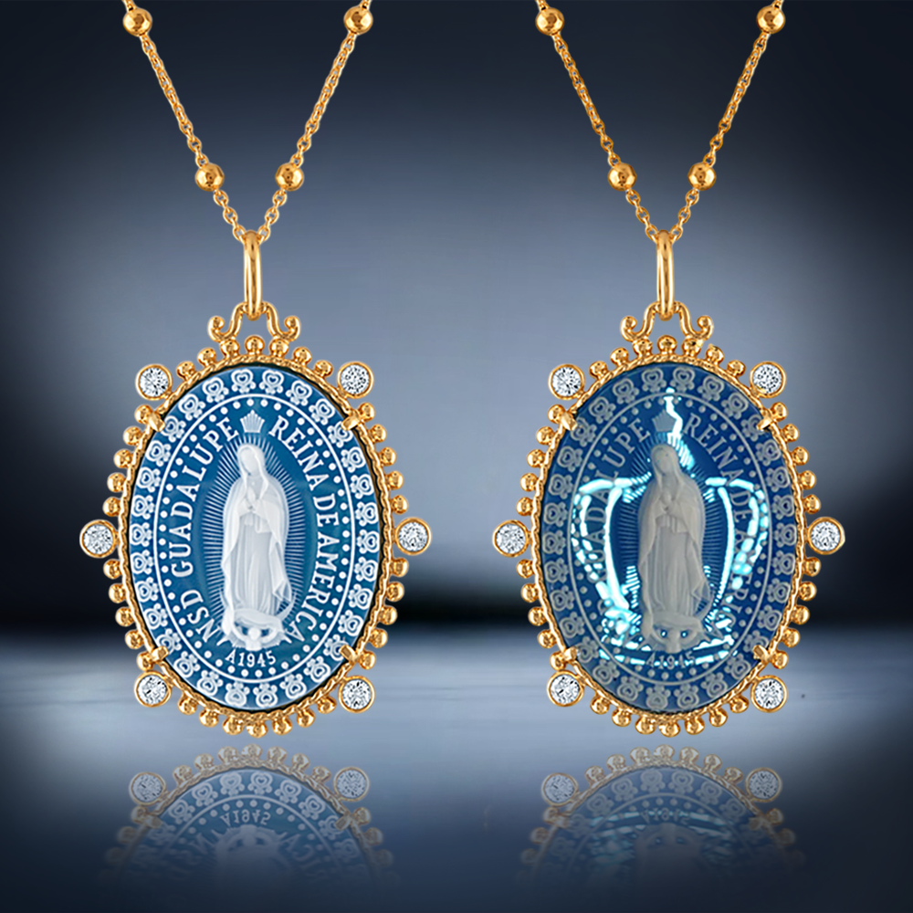 El resultado de estos esfuerzos creativos es un hermoso collar de plata 925 con baño de oro de 18 quilates que, al ser expuesto a la luz directa, refleja a Nuestra Señora de Guadalupe coronada.
