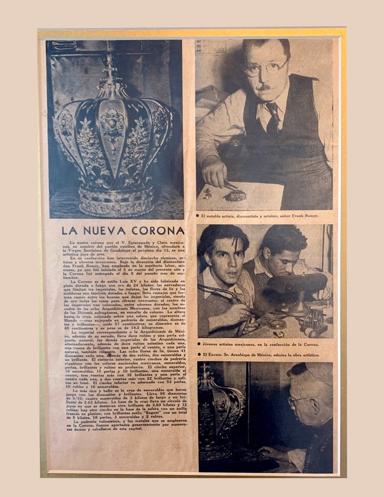 Gracias a esta trayectoria y merecida confianza, en 1945 le otorgan a Don Frank Ronay el privilegio de diseñar y fabricar la corona de la Virgen de Guadalupe para conmemorar el cincuentenario de su coronación de 1895.