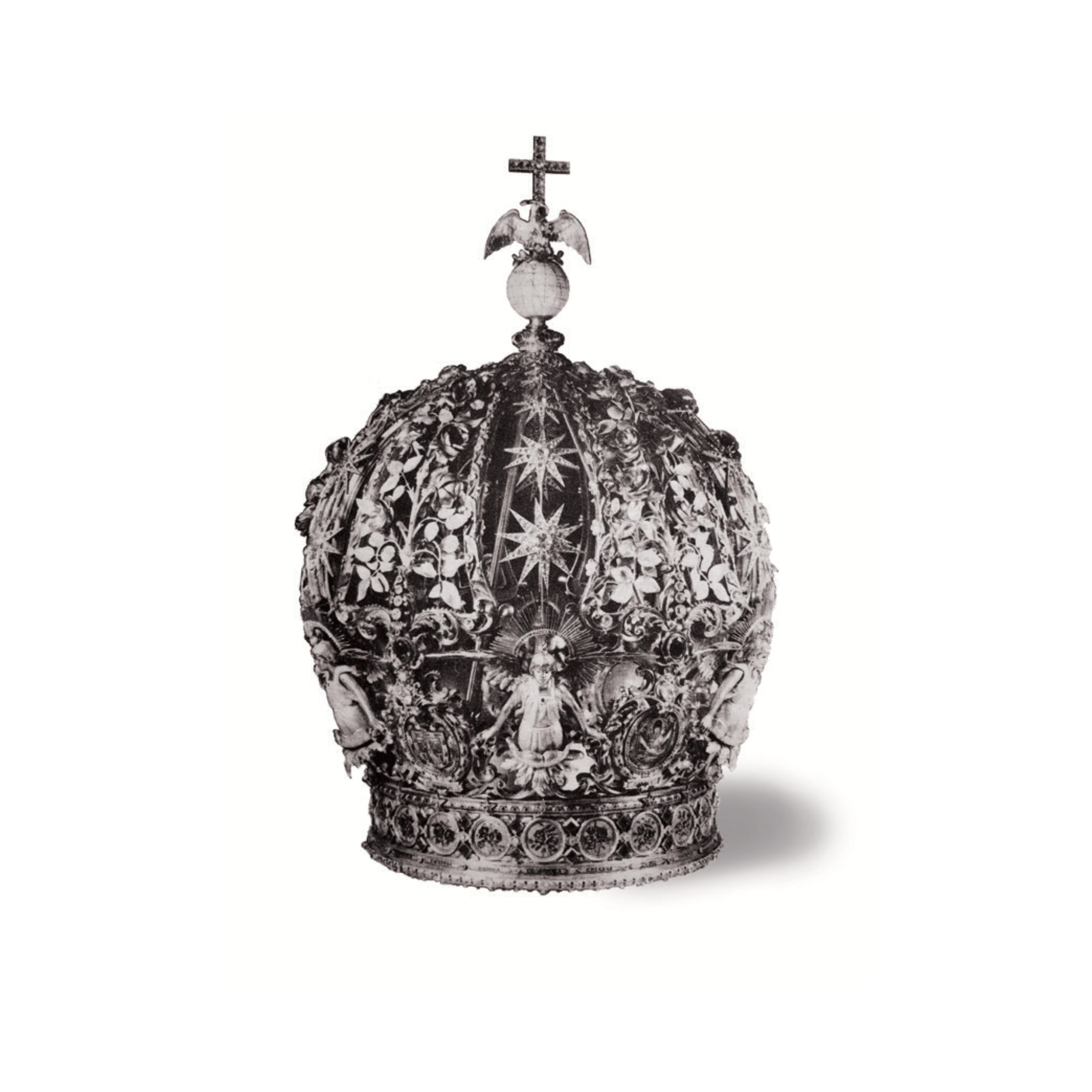 La imagen de la Virgen de Guadalupe, posada sobre la luna, está rodeada de un halo resplandeciente. Como reina del cielo lleva una corona de 12 estrellas radiantes sobre su cabeza, iluminando a México y al mundo.