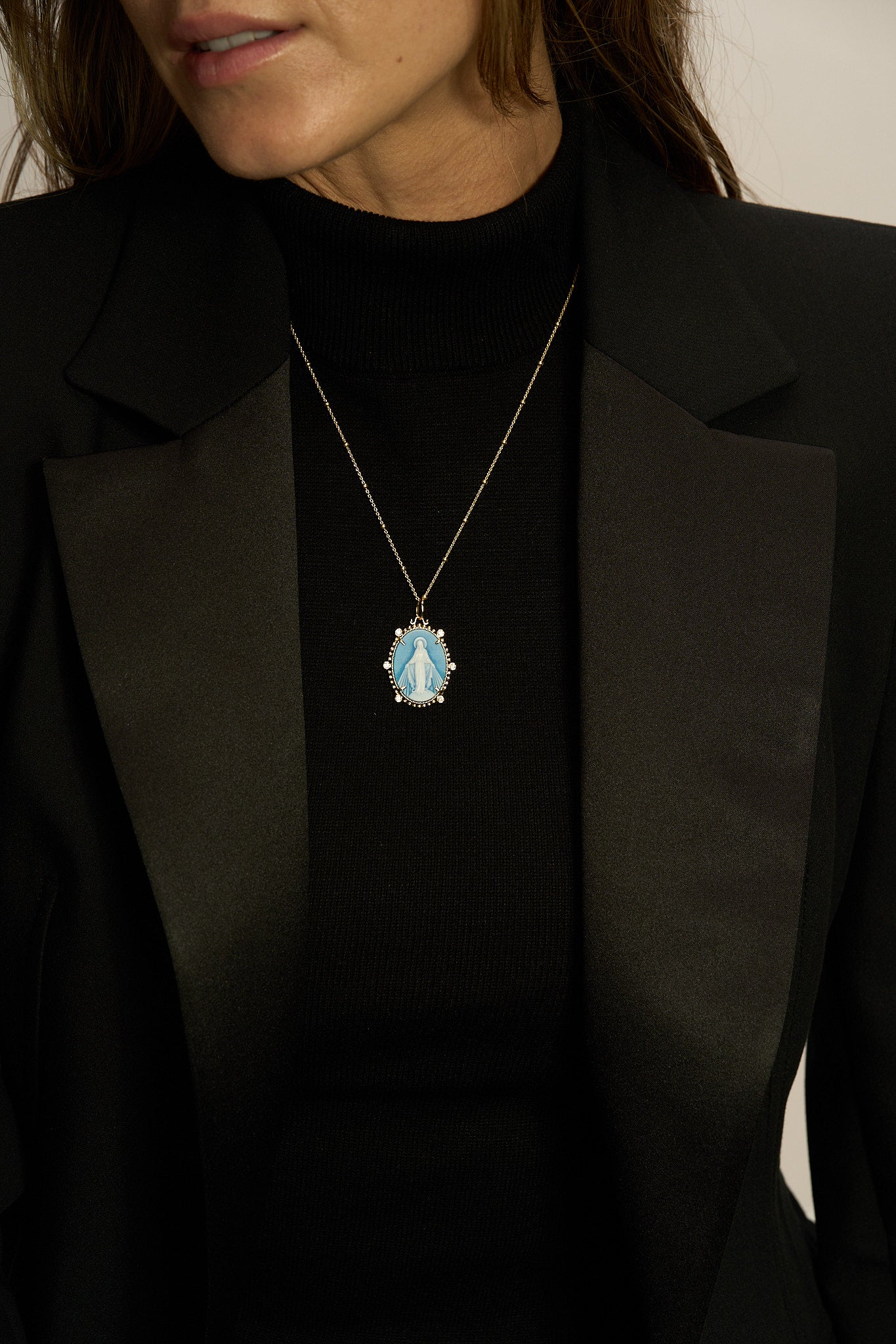- Guardando similitud e inspiración del medallón Reina y Emperatriz, distintas figuras devotas: La principal Virgen de Guadalupe, La Virgen Milagrosa y La Virgen Altagracia.